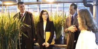 Katherina Reiche, stellvertretende Vorsitzende der CDU/CSU-Bundestagsfraktion und der CDU-Bundestagsabgeordnete Ulrich Petzold lassen sich von Professor Dr. Ulrich Wobus, dem Geschäftsführendem Direktor des IPK Gatersleben und einer wissenschaftlichen Mitarbeiterin eine Versuchsanordnung im Gewächshaus erklären. |